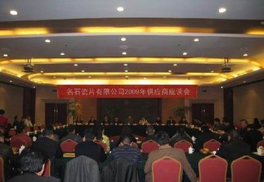 佛山市名石陶瓷有限公司为了答谢供应商在2008年对我公司的大力支持,2009年继续保持友好合作关系,对原材料的顺利采购,使生产正常有序的进行。2月12日上午10:00在公司总部招开了供应商座谈会,本次参会的供应方有:石英石、纳长石、五金设备类、包装纸箱类、色料等30多种类。近100位供应商。